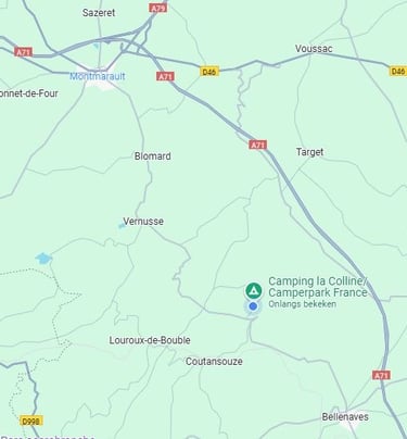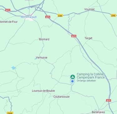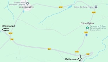 Vanaf noordoost: A79 afslag Montmarault, D2371 richting Montlucon. In Montmarault D68 richting Bellenaves. Voor de haarspeldbocht linksaf D118. De camping ligt rechts net voorbij het bordje Chirat l’Eglise.