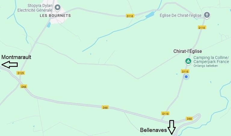 Vanaf noordwest: A71 afslag Montmarault, D2371 richting Montlucon. In Montmarault D68 richting Bellenaves. Voor de haarspeldbocht linksaf D118. De camping ligt rechts net voorbij het bordje Chirat l’Eglise.